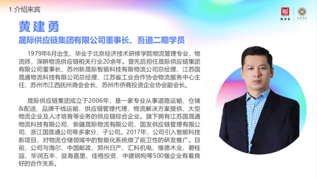 黃建勇:我們公司的主業是物流,從2000年開始在蘇州發展起步,以物流+供應鏈為優勢,以數字科技包括數字物流、智慧物流、軟件開發等為主營業務。公司的長期目標是每年必須以20%的速度增長,目前我們保持且超過這個數值的增長。經過多年摸索,我們發現在供應鏈中物流是主要的,現在很多做采購、集采、貿易的業務里都涉及物流,但由于不懂經營,導致供應鏈成本過高。這就需要物流人去規劃,我們就把這些經驗真正地搬到了每一處細節上,每一個節點上,每一筆成本上。