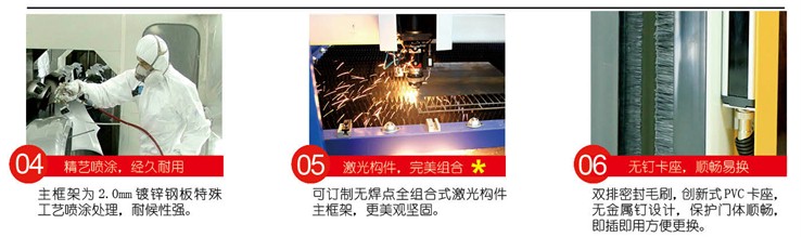 鍍鋅鋼板外部靜電噴塑;1.2mm厚;可選配鋁合金或不銹鋼;雙排毛刷密封;訂制顏色。 |