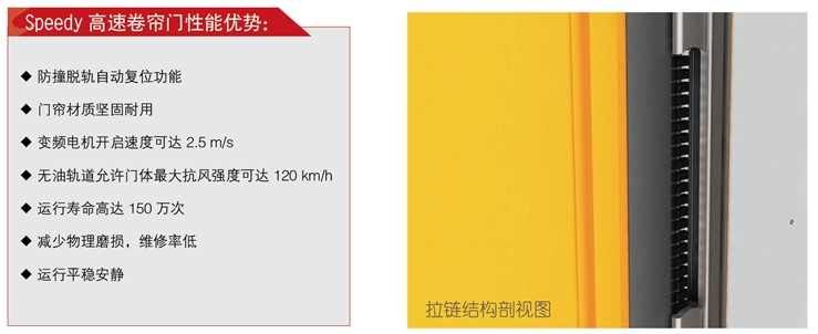 Speedy高速卷簾門的簾布由密度為700-1700 G/m² 的耐用聚酯纖維構成,可內嵌透明簾布作為視窗。此高速門獨特的導軌拉鏈式設計和一體式密封門體,可以在最大限度減少能耗損失的前提下,提供高效的物流出入口,保持室內原有的溫度條件和潔凈度。