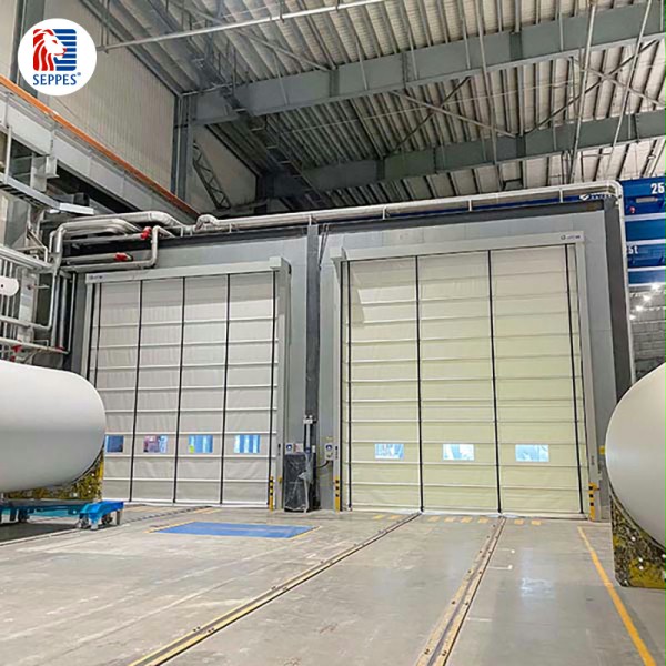 SEPPES(西朗)抗風堆積式快速門適用于物流通道出入口和大面積的洞口環境,采用折疊提升方式和多條內置或外置式橫向抗風杠桿,使風壓可以均布于門簾整體,可抗約10級左右強風,抗風性遠高于常規滾筒式快速卷簾門。